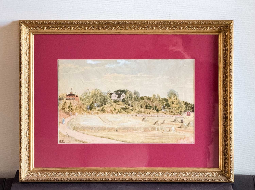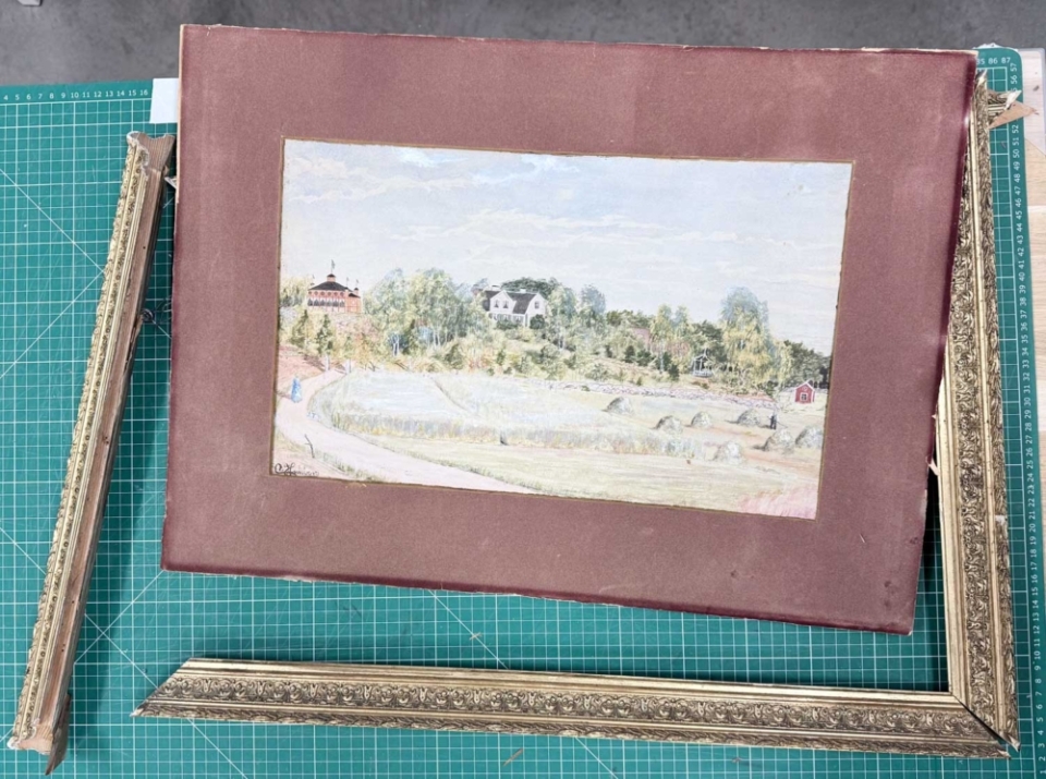Se exempel, trasig ramlist och gammal passepartout, lagad med ny passepartout och glas.
